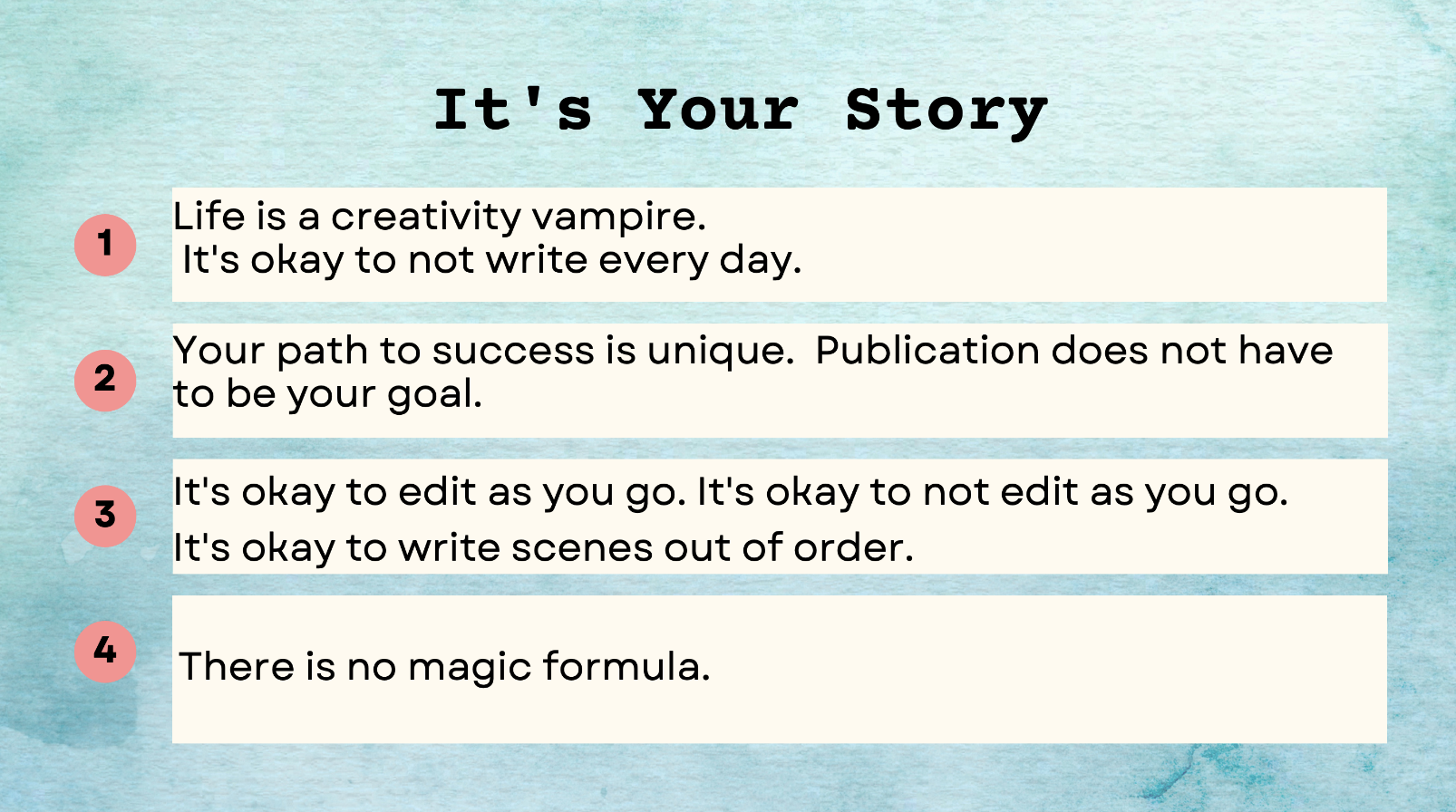 Do you have a story that just won't stop playing in your mind? Is this the year you finally write that novel? Have you started writing but struggled to finish? This workshop is for you!