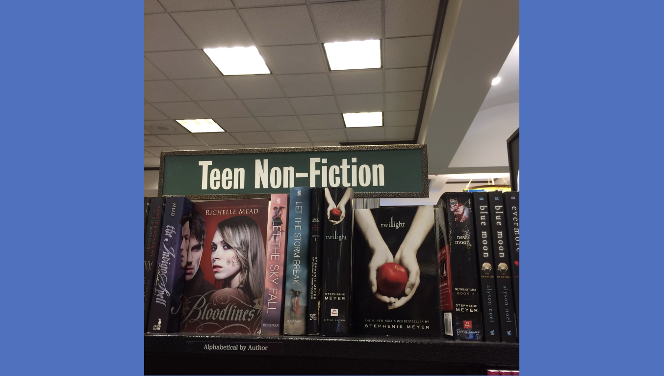 For example, I actually took this picture. This picture did not come from the Internet. This was at my local bookstore. I can tell you, "I was in my local bookstore when I saw Twilight and Bloodlines listed under Teen Nonfiction,"
